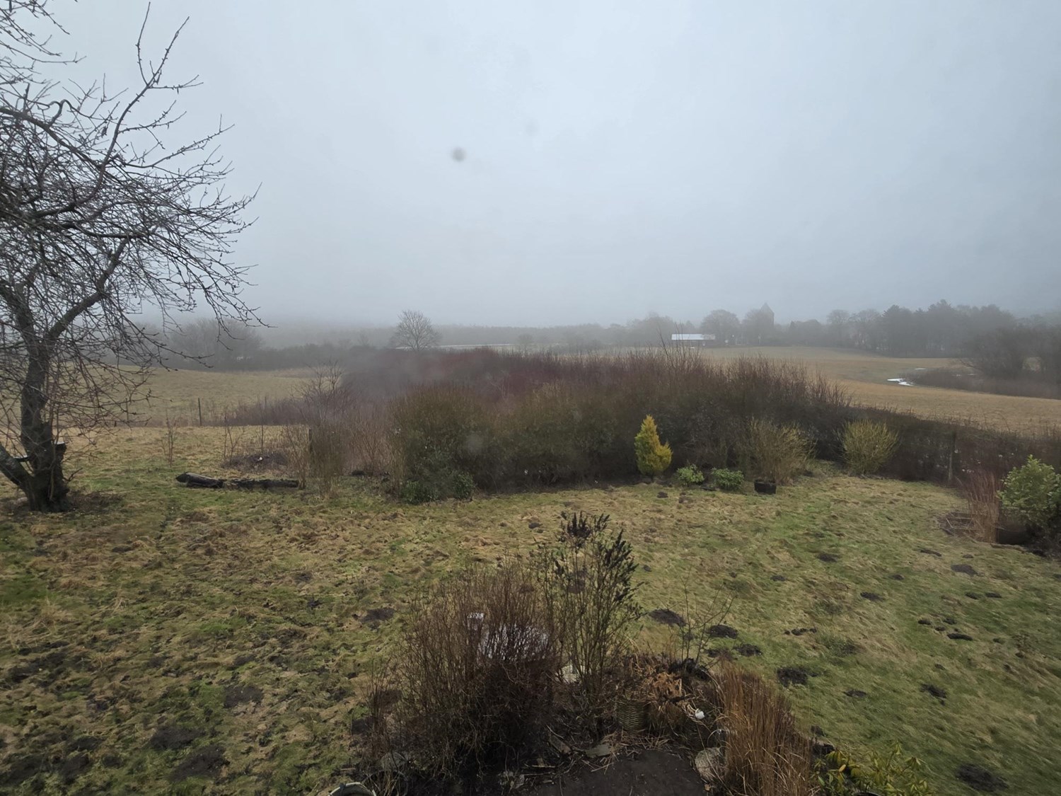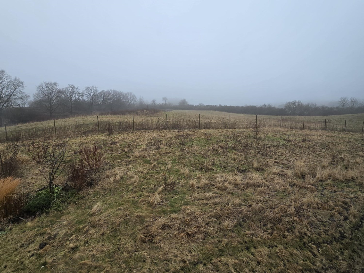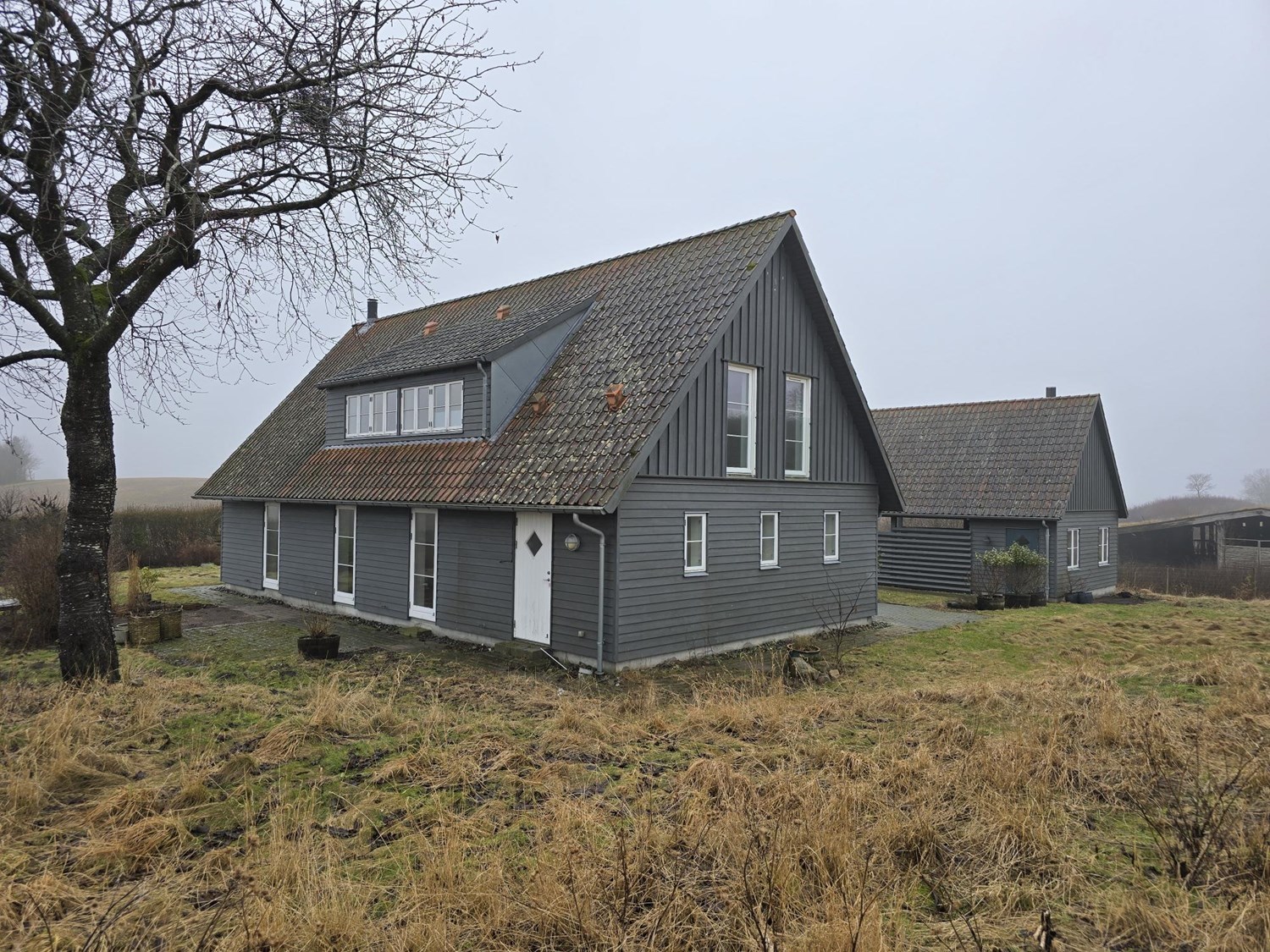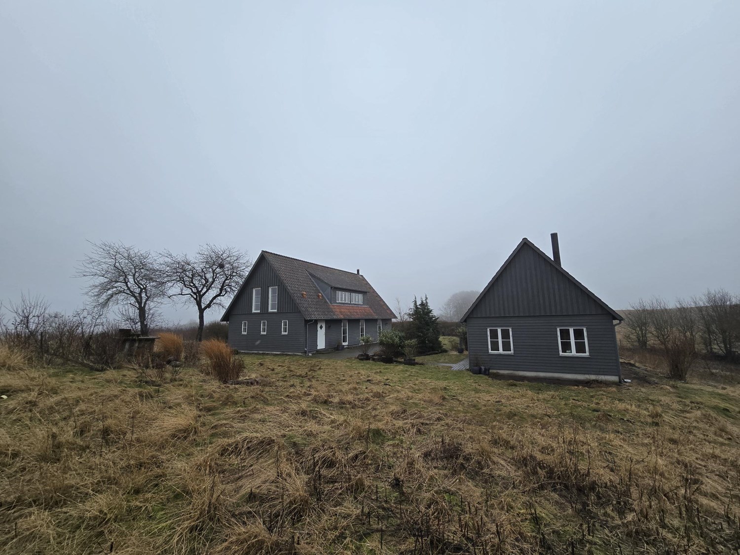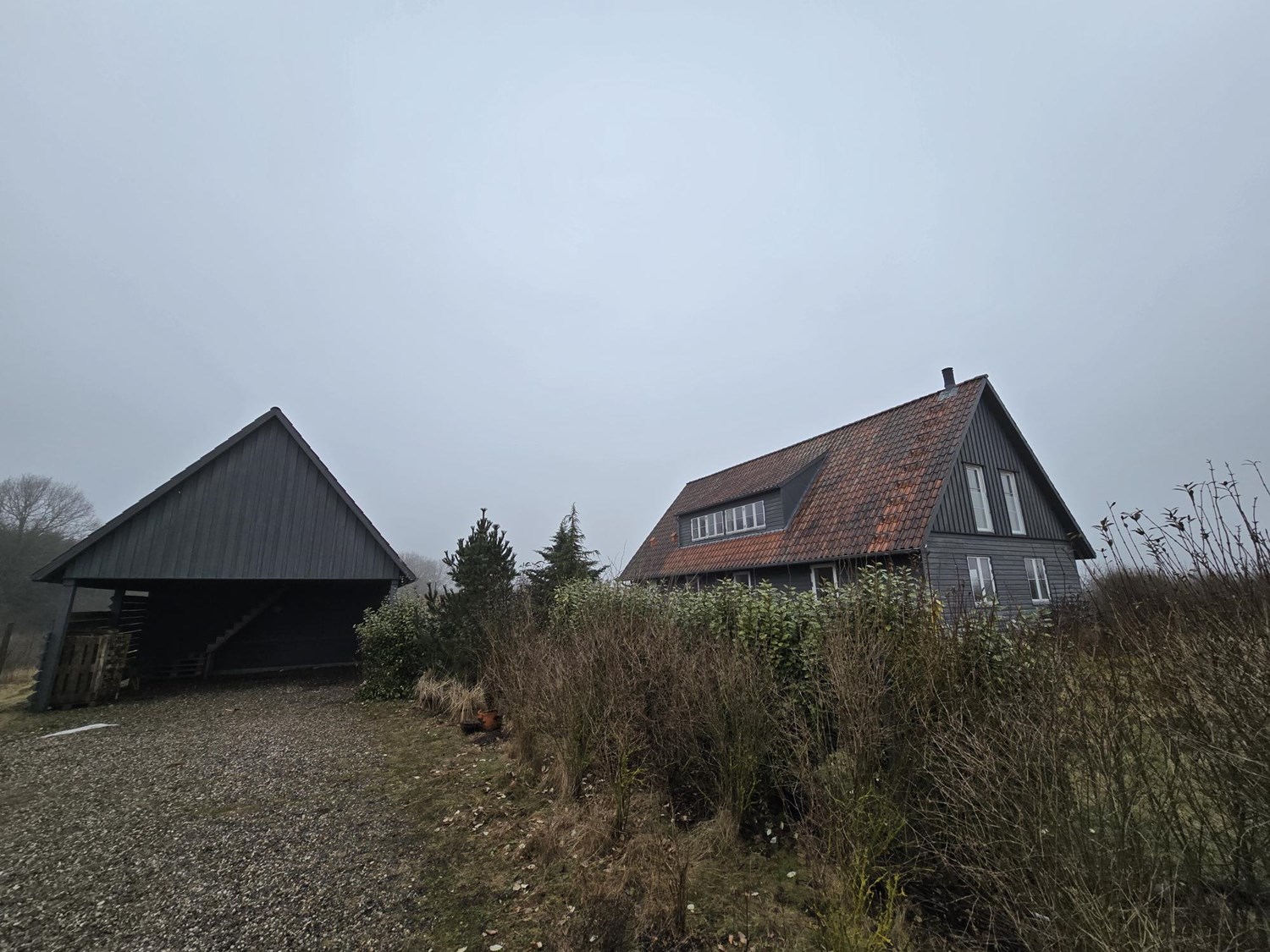 Det første man møder er en dobbelt carport i forbindelse med skur/fyrrum.